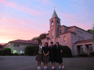 生徒たちが、口々に「夕日がきれい!」「空がバラ色!」と