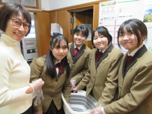 寄宿舎に戻った生徒が、さっそく先生と一緒に係のお仕事をしていました