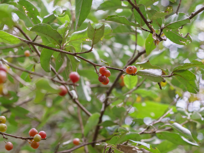 "Akigumi" trees are bearing fruit. They are deciduous shrubs in the Elaeagnaceae family that grow in sunny places such as open fields, mountains, and along rivers. Their name comes from the fact that their fruit ripens in the fall.