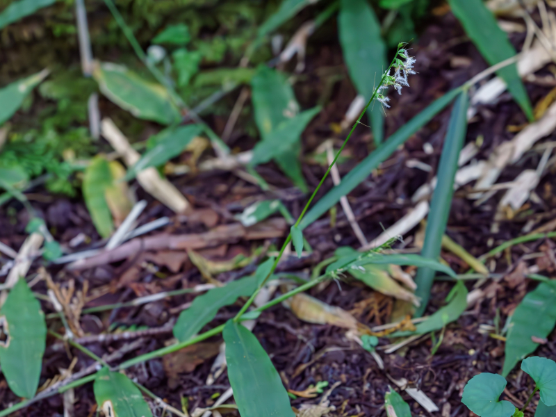 コチヂミザサが咲いています。林内など日陰に見られるイネ科の多年草です。和名のチヂミザサは葉がササの葉に似ていて、波打っていることに由来します。全体に毛が多いものをケチヂミザサと呼ぶのに対し、毛の少ないものをコチヂミザサと呼んでいます。