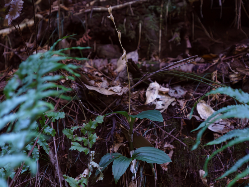 コクランが果実をつけていました。林床に生えるラン科の多年草です。果実の中にはホコリのように細かい種子がたくさん入っており、風によって飛ばされます。