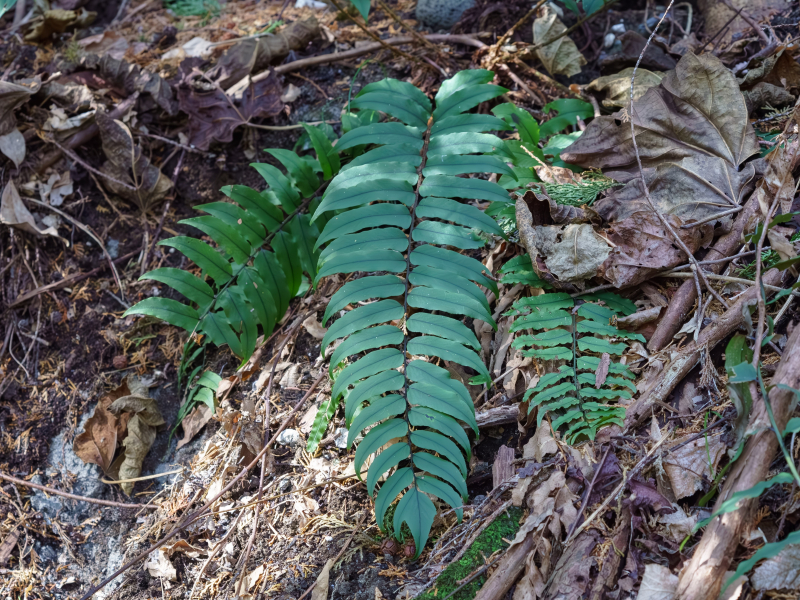 ヒノキ林の林床にヤブソテツが見られます。オシダ科の常緑のシダ植物です。和名は藪に生えるソテツという意味ですが、個人的にはあまり似ていないように思います。