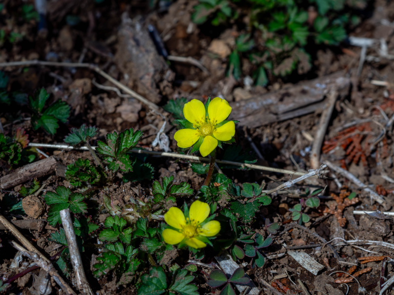 「共生の森」の近くでヘビイチゴが咲いています。落葉樹林の林床や草地に生えるバラ科の多年草です。普通種ですが、近縁のヤブヘビイチゴやその雑種と紛らわしい個体もあるので注意が必要です。