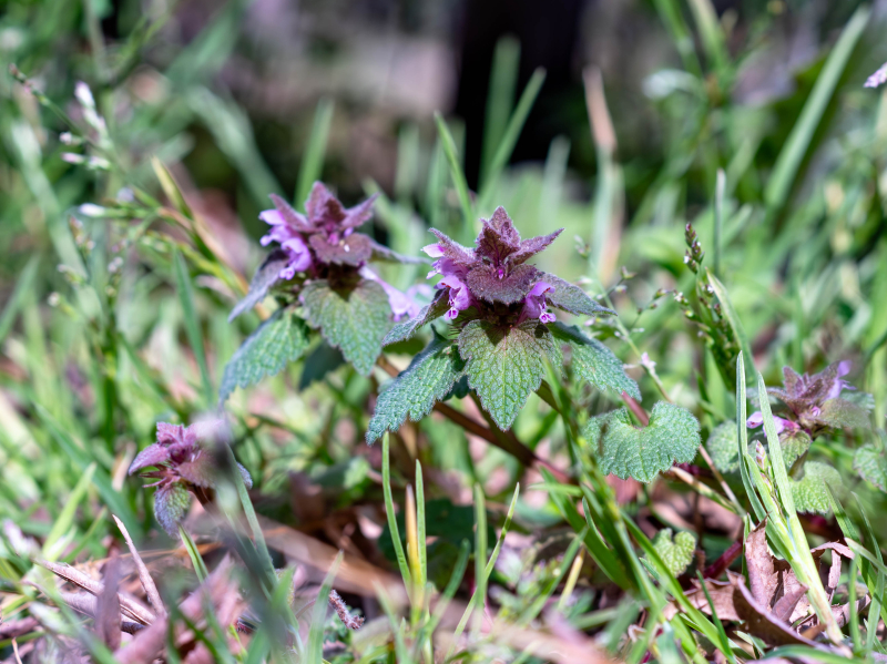 お茶畑のわきでヒメオドリコソウが咲いています。ヨーロッパ原産のシソ科の越年草です。ほぼ全国に分布し、北アメリカや東アジアにも帰化しています。