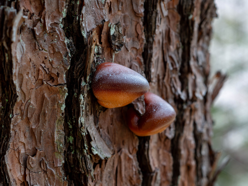 クヌギ林のアカマツの木からヒトクチタケが生えていました。ハマグリのような形をしたキノコの一種です。枯れ始めたアカマツにいち早く発生するキノコと言われています。