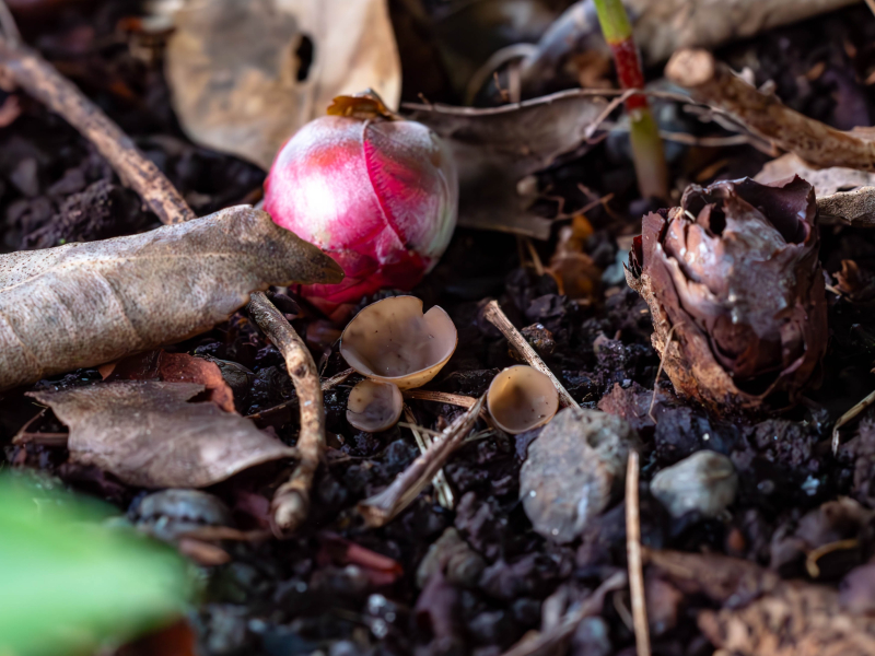 ツバキの木の根元にツバキキンカクチャワンタケが発生していました。春にツバキの花が咲くころ発生するキノコの仲間です。胞子は近くに落ちたツバキの花の上で発芽し、花を分解して生長します。その後、菌核を作り冬を越して、翌春のツバキの花が咲くころにまたキノコを作ります。