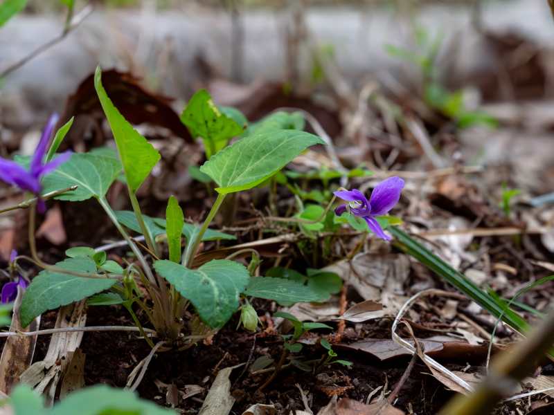 "Ko-Sumire" plants are in bloom in the bamboo forest. They are perennial plants in the Violaceae family that typically grow along forest edges. There are many related species in this group, and this species commonly grows near human dwellings.