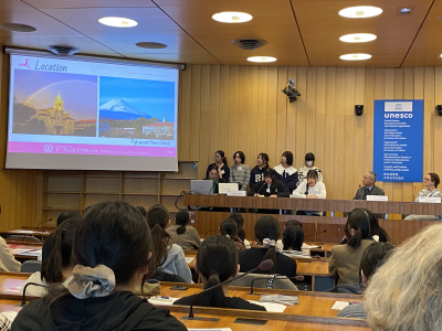 3日目のプログラムはパリにあるユネスコ本部訪問からスタートしました。国際社会が直面する課題に対し、学びを行動へとつなげていくことの大切さについてユネスコ職員の方々からお話を伺い、質疑応答を通して理解を深めました。また、プレゼンテーションやスピーチも行い、それぞれが自分の言葉で思いや考えを伝える貴重な機会でした。