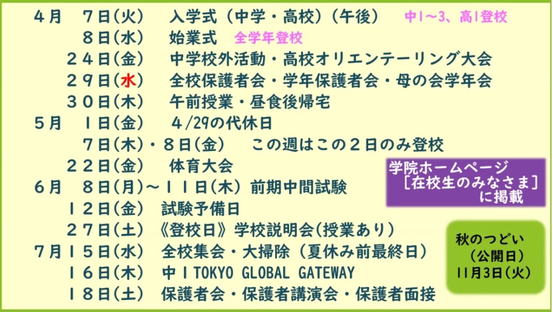保護者会でお伝えした来年度(夏休みまで)の主な学校行事の予定です。