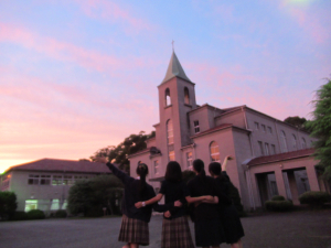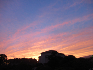 生徒たちが、口々に「夕日がきれい!」「空がバラ色!」と