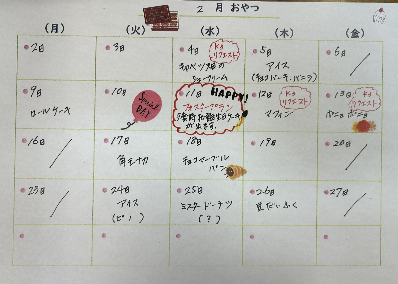 今月は、お食事と同じく卒業を迎える高校三年生のリクエストおやつが登場です。