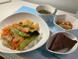 昼下がりのキッチンから、チョコレートの香りがただよってきました😊 デザートの仕込みのようです! そうして むかえたお夕食は…。 ブラウニーが焼きあがっていました。