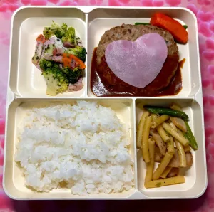 ハートののったハンバーグ弁当に、歓声があがりました! キッチンの方が、朝からハムを型抜きされたそうです💛 楽しいランチタイムになりました😊