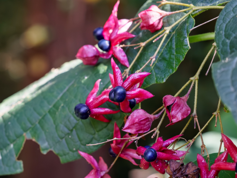 "Kusagi" trees are bearing fruit. They are deciduous trees in the Lamiaceae family known for their distinctive odor. Their blue-purple fruit can be used for natural dyeing.