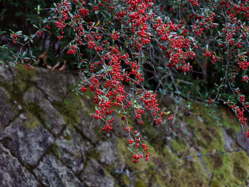 "Tokiwa-Sanzashi" trees are now bearing fruit. They are evergreen shrubs in the Rosaceae family that are commonly planted in gardens. In gardening, they and their relative species are known as "Pyracantha," and there are many cultivated varieties.