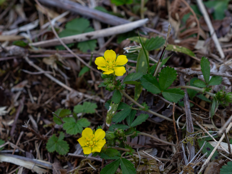 ススキ野原でミツバツチグリが咲いています。明るい草地に生えるバラ科の多年草です。和名は小葉が3個で、根茎(こんけい、地下にある茎)が肥大することに由来します。