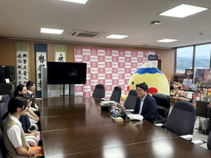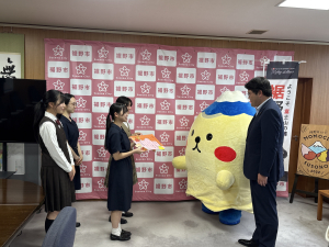 本日、高校3年生の秋のつどい委員が裾野市役所を訪れ、村田市長様とすそのんに秋のつどいの招待状をお渡ししました。市長様が優しい声を多くかけてくださり、終始温かい雰囲気につつまれた時間となりました。当日もご来校してくださるそうで、秋のつどい委員にとっても大きな励みとなりました。