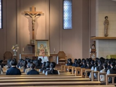 10月16日の朝、感ずべき御母の祝日を中高それぞれでお祝いしました。この祝日は、ローマの修道院にある聖母マリアの絵画を記念する祝日で、聖心会が大切にしている祝日です。この絵画は、1840年代にポーリーヌ・ペルドゥーローによって描かれ、椅子に腰かけて静かに目を閉じて祈りをささげているマリア様は「祈り」を意味し、そのマリア様の周りにある本は「知性や学問への関心」、糸を紡いでいる様子は「労働の尊さ」を意味しています。