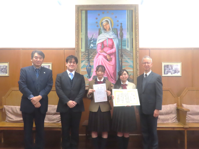 中3の社会科では、毎年夏休みの宿題で税に関する標語を作成し、全国間税会総連合会が主催している『税の標語』に応募しています。毎年本校の生徒が入賞していますが、今年は2名の生徒が入賞しました。先日、沼津間税会の竹内輝明様にお越しいただき、入賞した生徒への表彰が行われました。入選した作品は、JR沼津駅北口にあるキラメッセぬまづで行われる確定申告会場で2026年2月16日から展示されます。