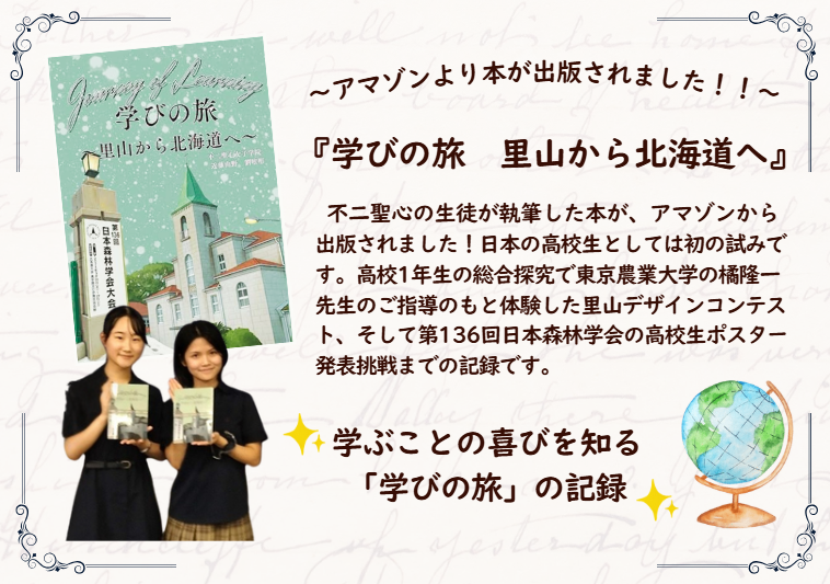 不二聖心の生徒が執筆した書籍『学びの旅 ~里山から北海道へ~』 をアピールポイントとした出版企画で、Amazonが文部科学省主催の「いいたいけんアワード」コンテストにエントリーし最終審査に進出したことが、12月12日に発表されました。1月20日には文部科学省にて最終プレゼンテーション審査が行われ、不二聖心で撮影した映像なども使用される予定です。