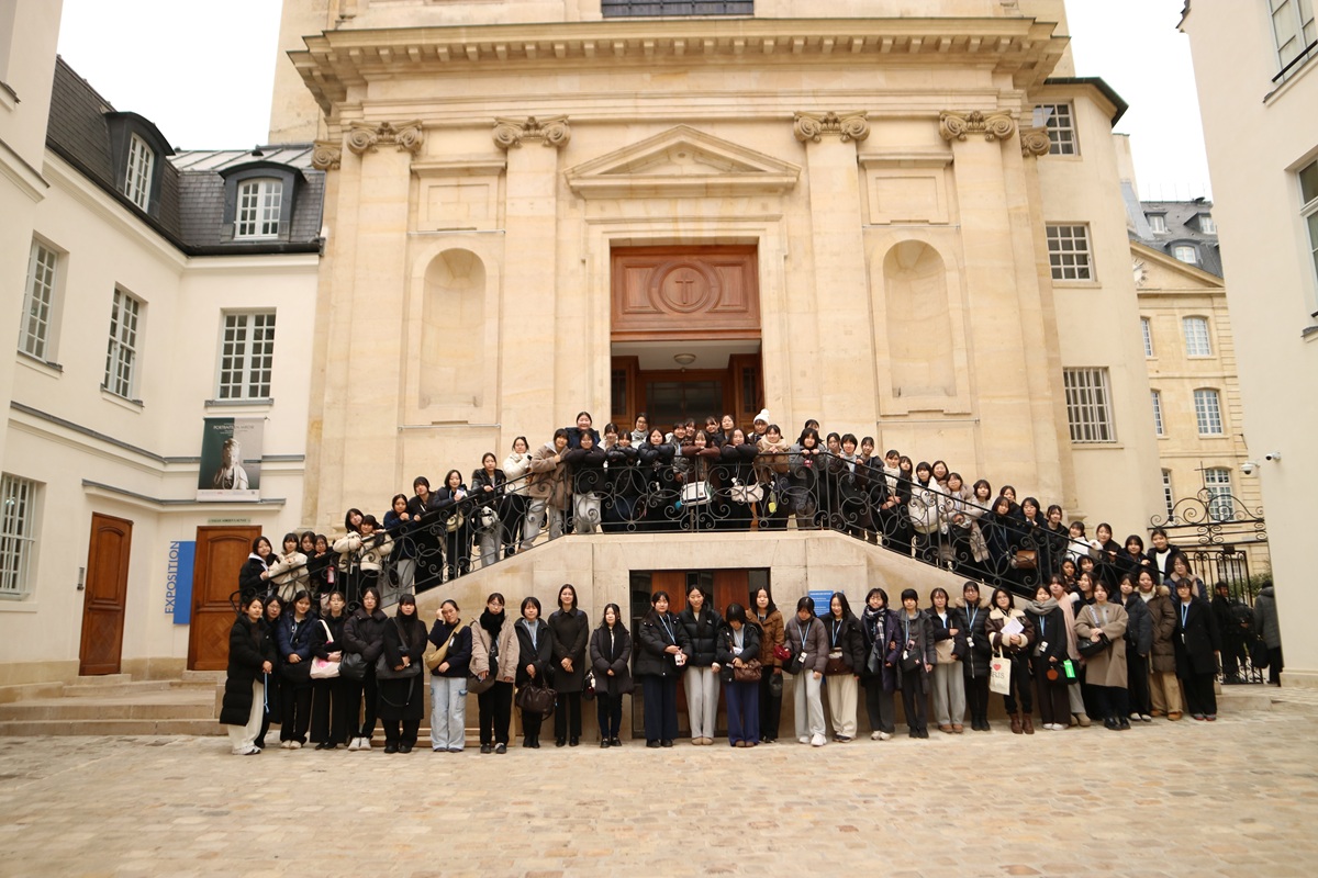 高校2年生のフランスルーツへの旅も最後の研修の日を迎えました。現在の日本のカトリック教会の源泉につながるパリ外国宣教会の本部を訪問しました。パリ外国宣教会は広くアジアを中心に宣教をする司祭の養成と派遣をし、日本には、長崎のプティジャン司教様やド・ロ神父様、また不二聖心ともつながりのある神山復生病院を創設したテストウィド神父様などを派遣してきた宣教会です。パリ本部のスタッフの方にお話をしていただき、また展示を見ながら、宣教地の文化を受け入れ命がけで宣教した司祭たちが、キリストの愛を伝えようとしたことを肌で感じることができました。約1週間のこの旅で得たことを糧に、生徒たち一人ひとりが宣教者のように愛を伝えていく人に育っていけるよう、「未来に向かって」の聖歌を歌いフランスでの研修を終えました。