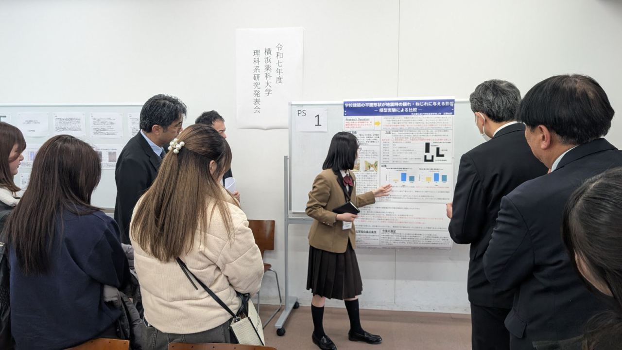 本日は中高大連携を締結している横浜薬科大学にて大学の卒業研究発表会があり、本校生徒と教員が参加いたしました。そこで、大学生に混じり、個人研究の発表もさせていただきました。研究題目は、「学校建築の平面形状が地震時の揺れ・ねじれに与える影響 模型実験による比較 」でした。大学教授や学生の皆さんが次々と質問をしてくださり、実りの多い研究発表の場となりました。また、物理化学賞もいただくことができました。