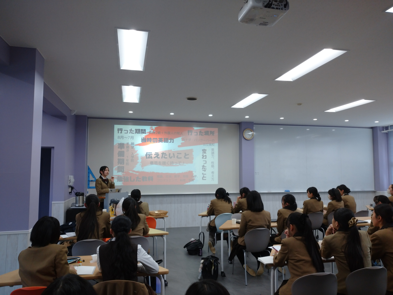 2月11日、自主団体Dear Worldによるイベント「教えて!高3」が開催され、会場には多くの下級生が集まりました。今回のテーマは【英語を進路にどう役立てる?】。「留学とは?」「今しておくべき準備は?」 「留学と進路はどうつながる?」など、リアルな経験談に参加者は興味津々で真剣にメモをとっていました。また、後半の「質問コーナー」では、一人ひとりの悩みに優しく答えてくれる場面もありました。