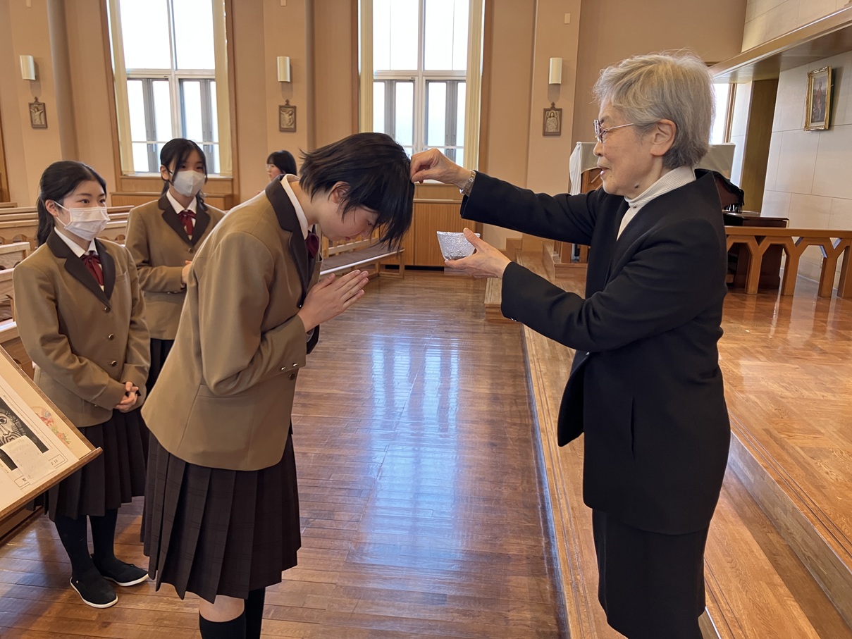 シスターは、聖堂で生徒が集まってくるのを待っていたけれど、一番待っていたのはイエス様でしょう。イエス様の後に従い、そのみこころにかなうようにするために、悪や誘惑を退け、善を行うために共に歩むことが求められています。と語ってくださいました。そして、シスターから一人ひとり、灰「回心して福音を信じなさい」と灰を頭にいただきました。
